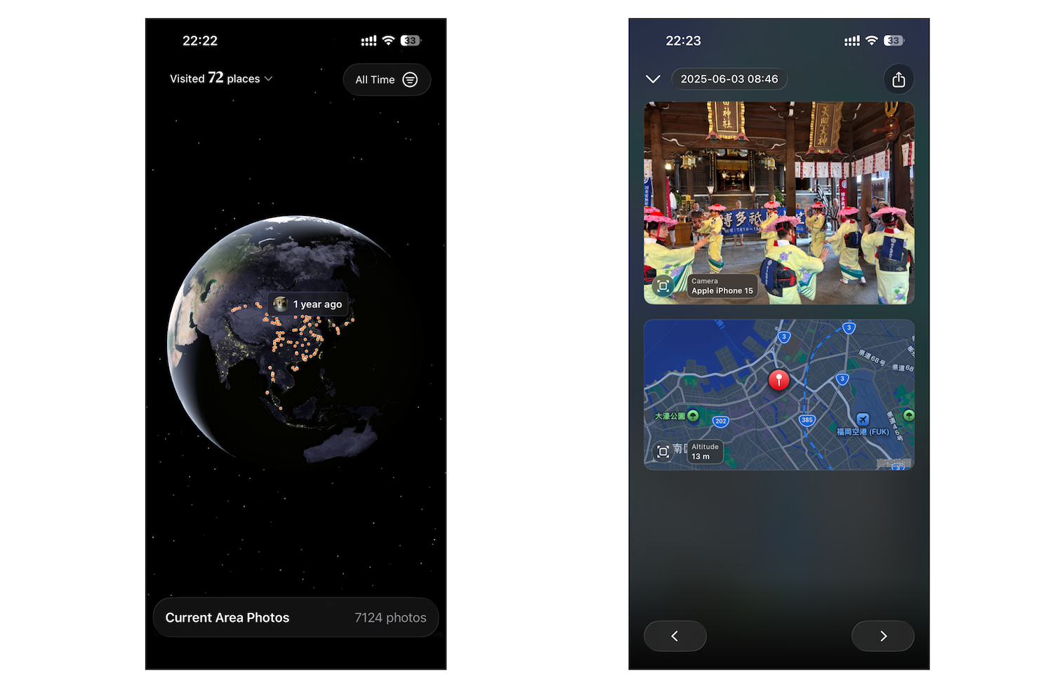 除了展示用户设备里的照片标签点数据,最好是能够进一步提炼出一些额外的第二层数据,否则就显得比较“平”。在新版本中,虽然受限于 MapKit 的反地理编码能力,大批量 gps 数据查询时会被强制限流,只能等待什么都做不了。这个限制在“一生足迹”里也存在,提示用户需要等待最少两小时,且不要杀掉 app。如果是使用国内地图厂商 SDK 里的接口或者自建服务查询会非常快,类比携程、马蜂窝的做法。大家都是获取用户照片数据的 exif 信息。目前针对这个问题我没有好思路,只能等着,可能后面做 andriod 版本时切换到国内地图 SDK 会有好转吧。