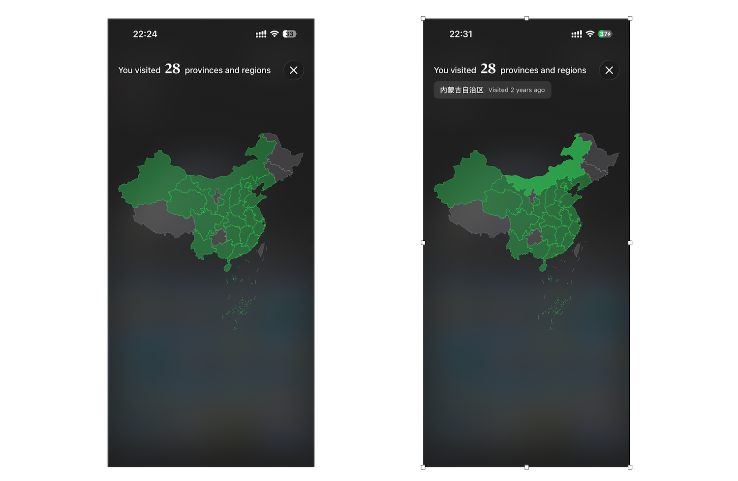 换一个思路的话,那就是已经拿到了用户所有照片 exif 信息里的 gps 数据,再结合一份中国省份地理区划 gps 点位数据,就可以明确出用户到底去过中国哪些省份和地区。不清楚大家是否和我一样有这种想法,之前也有分享过,我曾经梦想在自己 25 岁之前走完全国所有省份和地区,但直到现在还差 6 个。通过携程可以结合你的出行数据检索出来,但不够精准,如果你买了交通票但退票了,携程也会认为你去过。远不如通过实打实的照片数据来得准确。