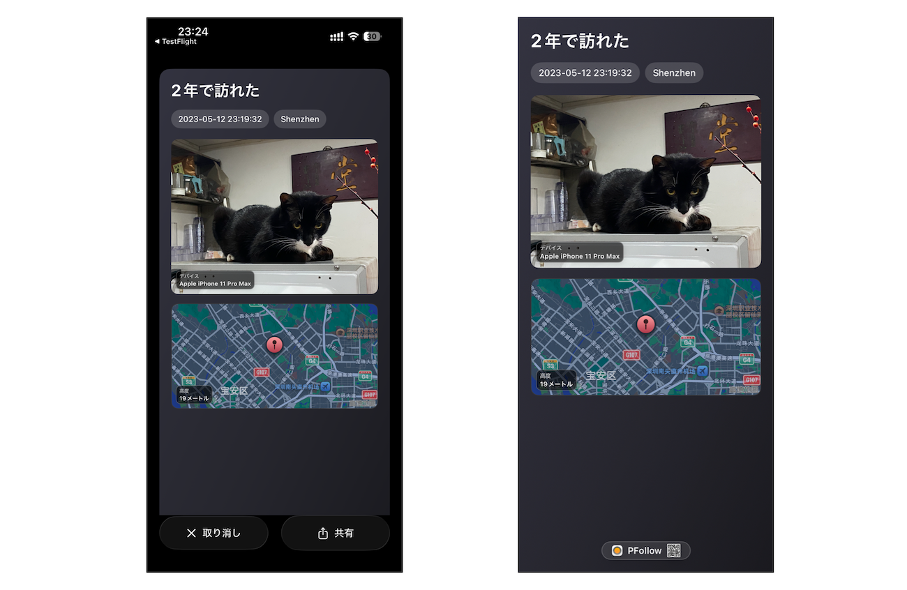 从“去留”这个 app 中学习到了一点,虽然 PFollow 和去留的产品定位完全不同,但展示出一些必要的关键信息可以多给到用户一些“感觉”。因此在照片模块上加上了拍摄设备,在地图模块加上了海拔数据,一些朋友的实际体验下来,看到自己当初拍摄的照片设备还挺有意思的。下一个版本中可能还要进一步挖掘可展示的信息,甚至恢复“密语”功能。