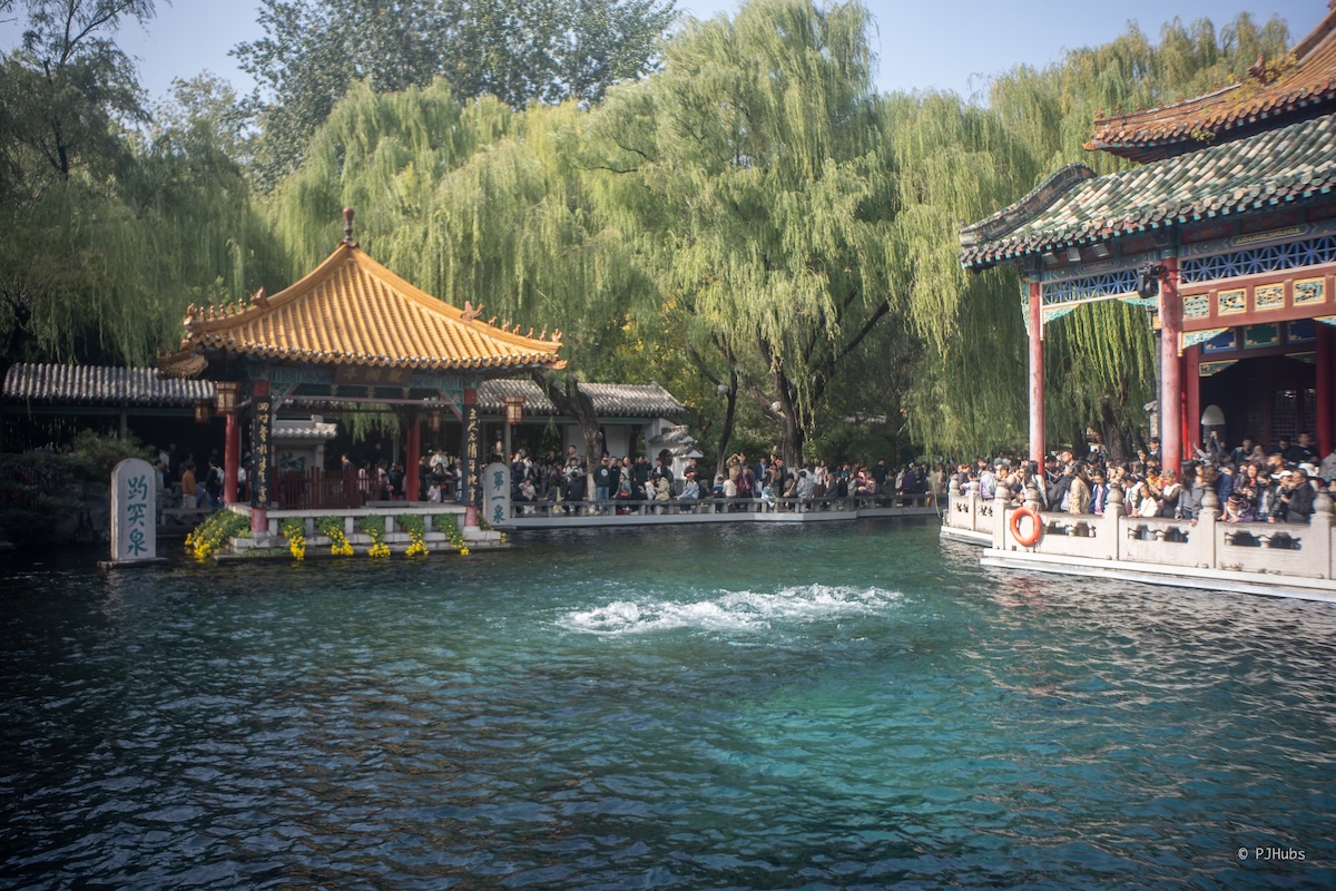 泉城广场的西边就是趵突泉,我在走向趵突泉南门的路上远远望过去宛如黑洞一般吸收了几乎那一片的人群,估计这泉里得有不少游客呀。趵突泉门票 40 元,最终整体体验下来不算贵,园区整体除了趵突泉泉眼附近的那一小片地方非常非常挤以外,其余地方倒也还好。为了吸引游客,泉水中放养了大量的锦鲤,前段时间也经常刷到安保提醒游客不要再喂鱼了,都胖得都快游不动了。像如此脆弱的、长时间的自然景观济南政府必然也会给这个“天下第一泉”大量的补贴,要不然真的有可能我们这一代人都见不到了。
