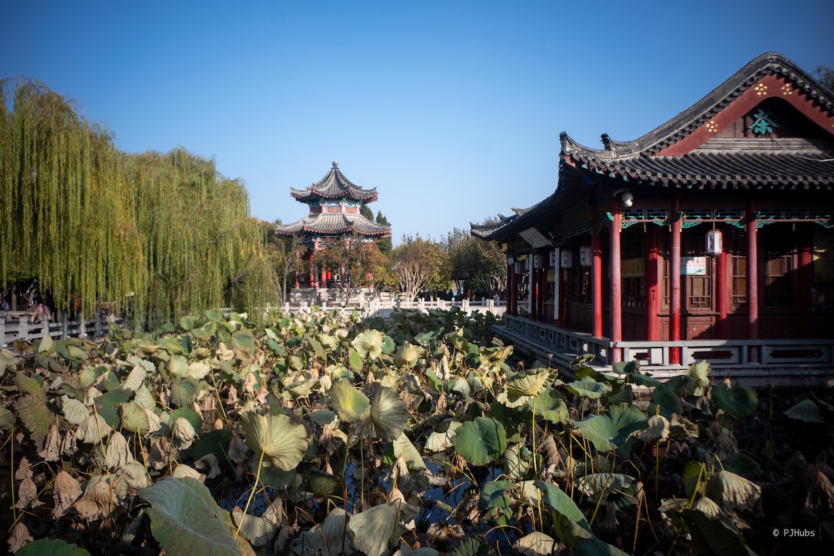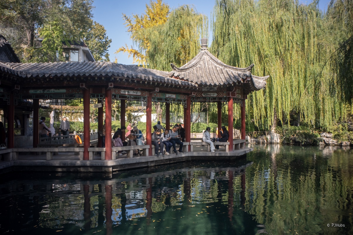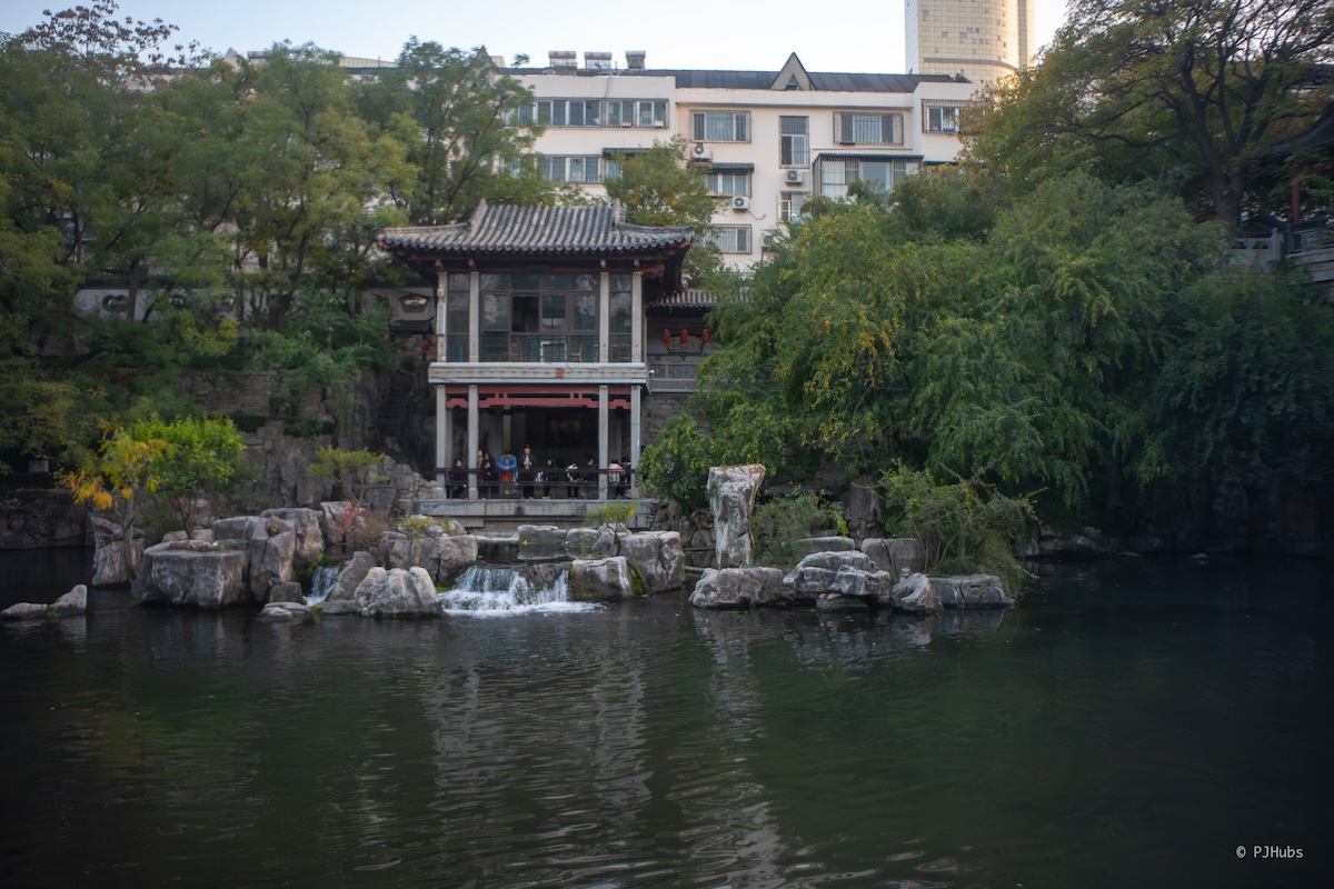 五龙潭的人流量对比趵突泉骤减,虽泉水的姿色不如趵突泉那么粗狂,但如果你对泉水喷涌之景并无念想,只是想看看泉水是怎么一回事,那和趵突泉隔着一条马路的五龙潭就是最佳选择。五龙潭里有一片很大的湖,如果你并不赶路,完全可以用半小时的时间喝一次大碗茶。我本身对茶没有想法,再加上也不愿意用静态的方式来看动态的泉水,我喜欢通过多个角度和层次观察,也就作罢。五龙潭本身是免费的,园子里有大量的亲水区域供小朋友玩耍,水质远比各种水上乐园甚至泳池里的水来得放心,看到了好几个小朋友就这么光着脚踩在水里,甚至还有更小的小朋友直接就趴在了水里,只不过秋天的济南还是有些凉意,可以想象出来五龙潭的夏天是多么的热闹了。