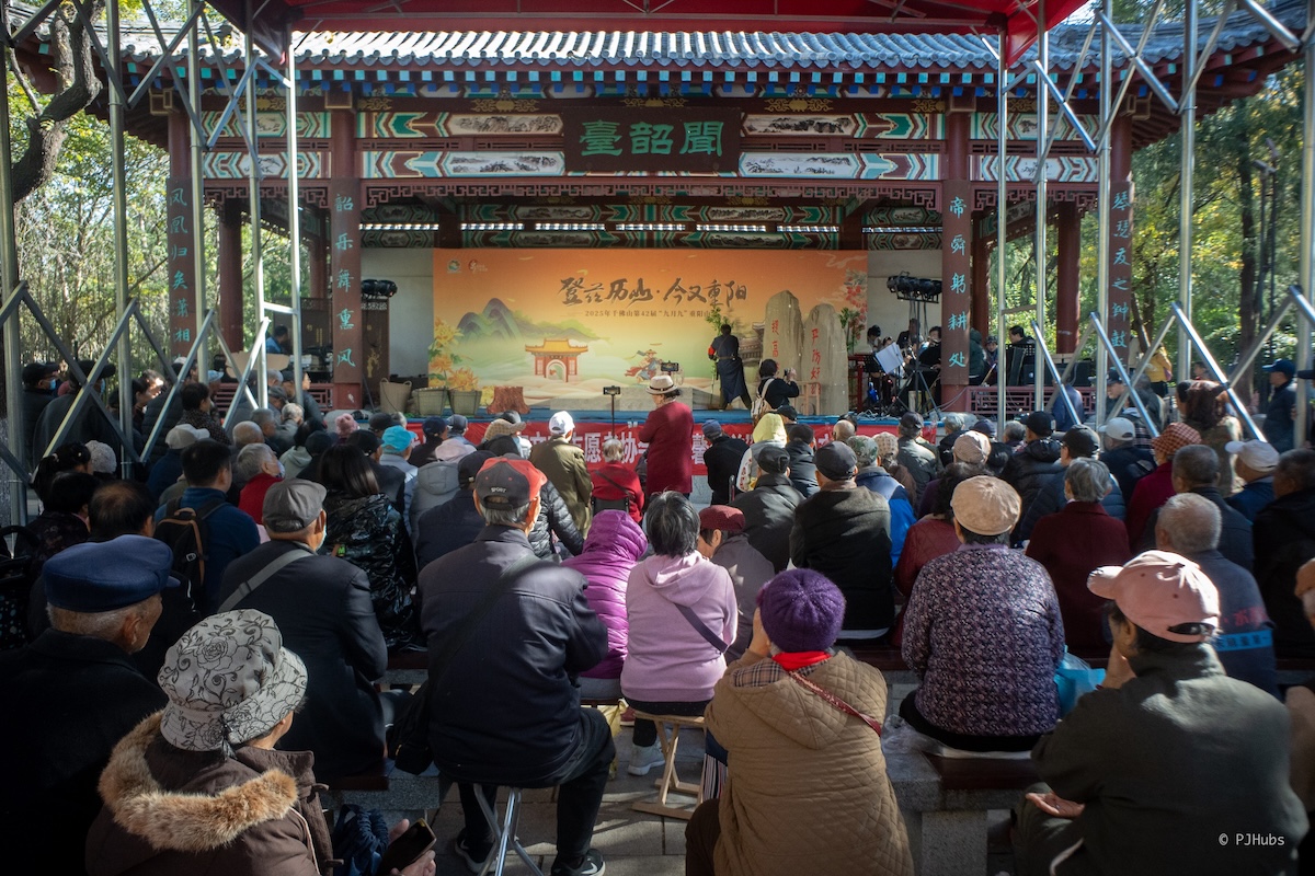 第二天我原本想着早些起床爬个千佛山下午再去博物馆,订了个 7 点半的闹钟,愣是磨叽到了 9 点才去吃早餐,将近 10 点了才到达千佛山。好巧不巧,正好碰上了九月九重阳登山节,比昨天在趵突泉多出大几倍的人流量挤在千佛山的登山路上,千佛山未正式开始爬山前的这段路其实很宽,但道路两旁排满了摆摊的小贩儿,卖什么的都要,观察下来卖山货、特产、民俗手工艺品的居多,仔细看的话远比逛小吃街有意思多了。甚至还有我看着非常像样板戏的唱戏班子在表演,台下坐了乌泱乌泱的大娘大爷,有点我想象中北方农村里戏台看戏的感觉了。