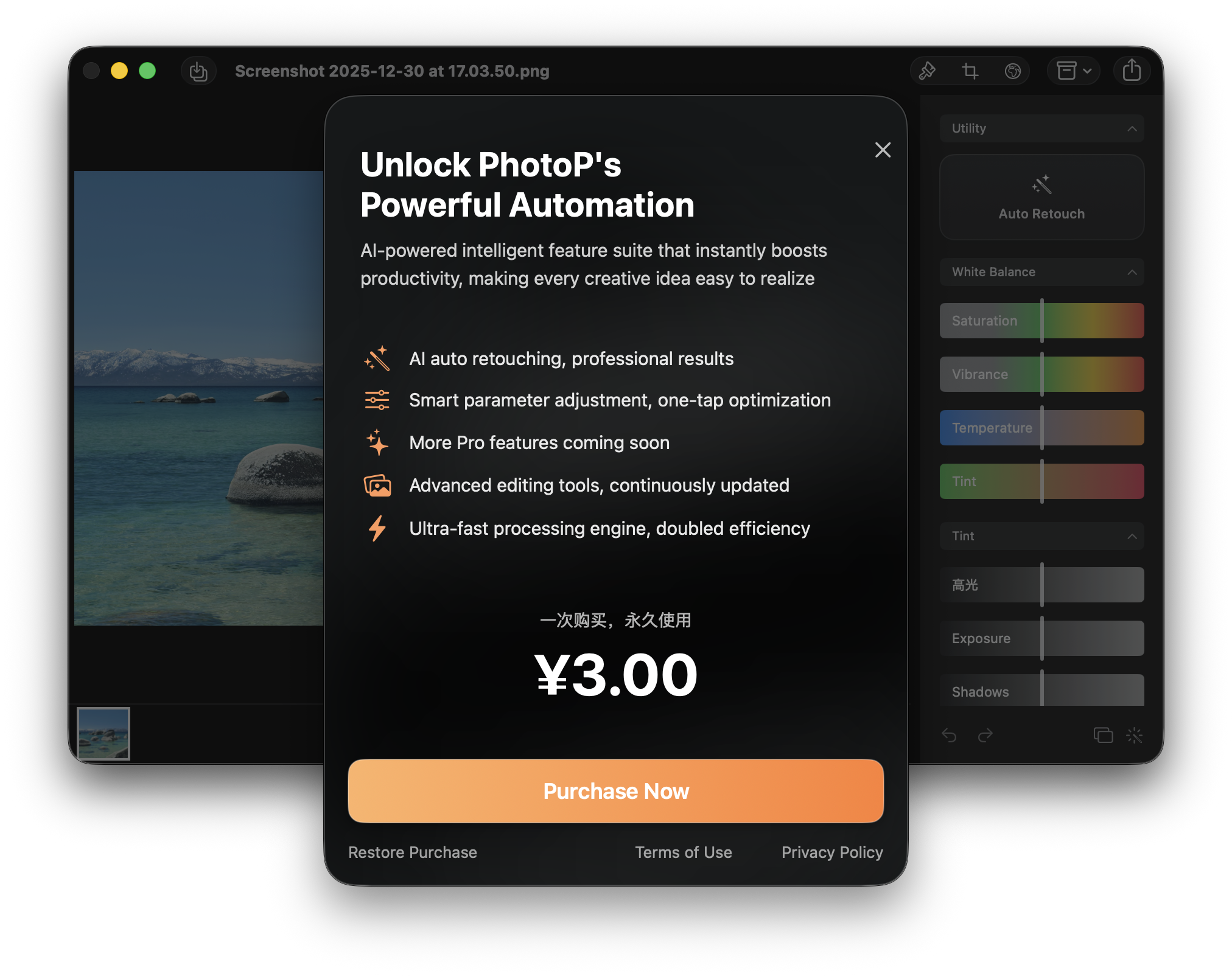 目前薄桑在 PhotoP 做的“自动修图”功能正式解锁,仅需 3 元即可抢购解锁高级能力。买的越多,薄桑后续开发动力越足!