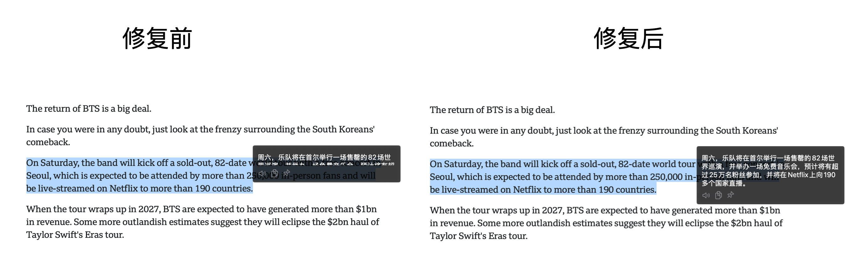 本质问题就是 SwiftUI 的高度渲染计算和 Text 标签内容高度计算二者出了差异。修复的思路也很简单把邮件截图丢给 AI 就完事了,反正不能改字体只能改字号,并且翻译结果窗口的宽度是固定的,最终只需要根据字号大小和翻译后的字数估算一个宽高即可。这个思路系统都有完整 API 可以解决,本质就是计算一段字符串在固定width或 者height下最终的boundingBox多大。