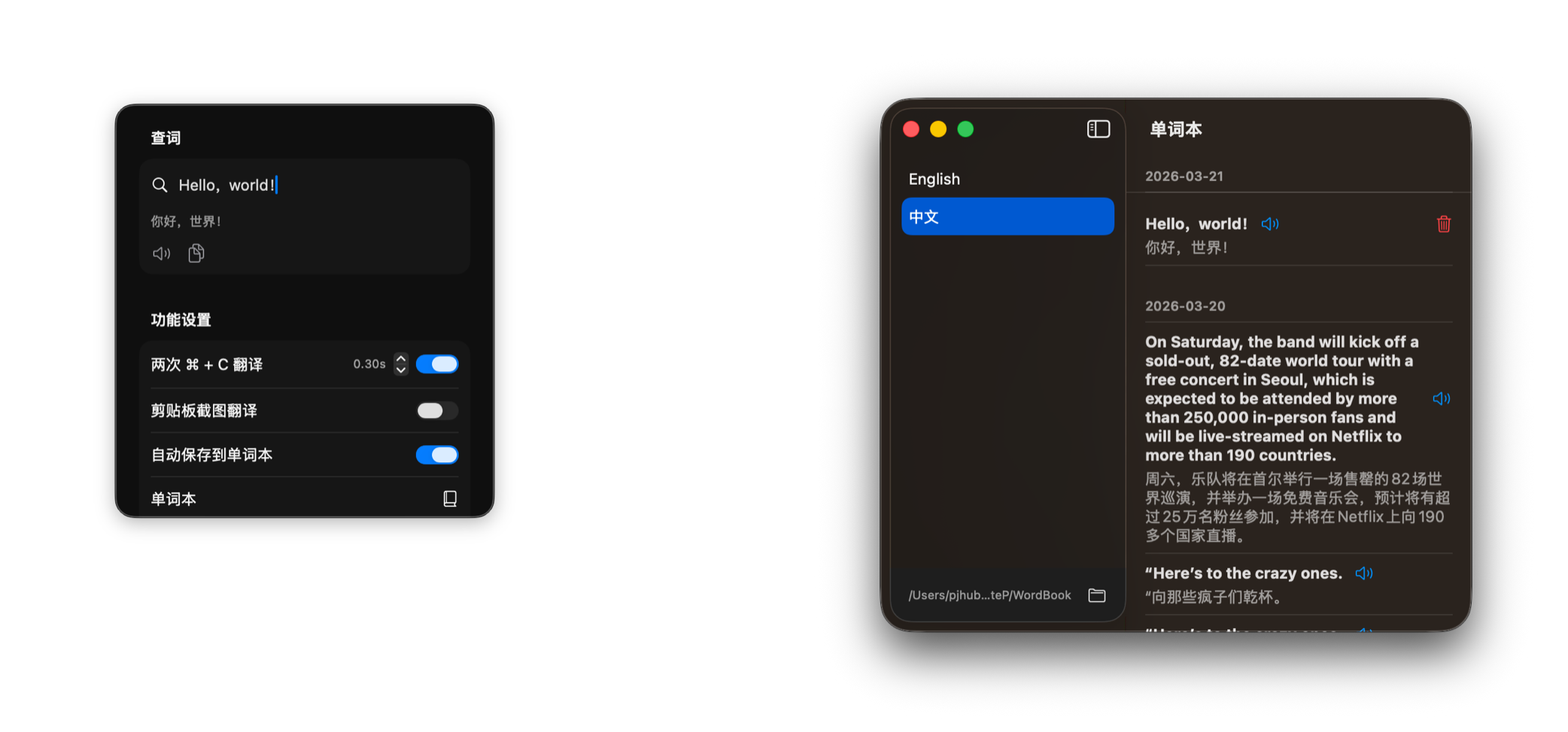 至于单词本,因为并不想做大,基于 md 格式做了一份本地文件存储后就算暂告一段落了。如果哪个用户想导出曾经查过的词,拿着这份 md 文件自己用 AI 自行 filtering 一波数据都能按照想要的格式处理好。