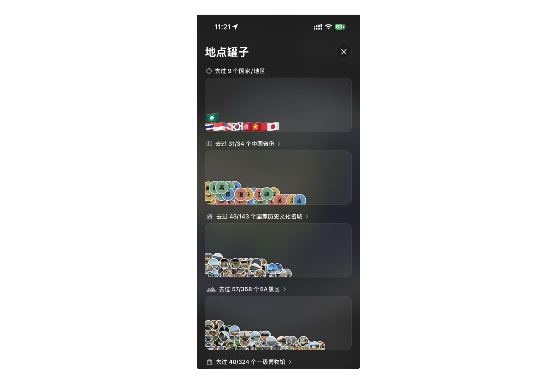 地点罐子这个东西是延续了九年前实习时做的一个游戏思路。基于设备的陀螺仪和物理引擎搭了个框架,筛选用户去过的地方包括国家、中国省份、5A 景区、一级博物馆和历史文化名城都会自动检索到不同的罐子里,罐子里的「珠子」会跟随用户设备的倾斜角度而移动,我自己体验下来还可以,希望你能喜欢。