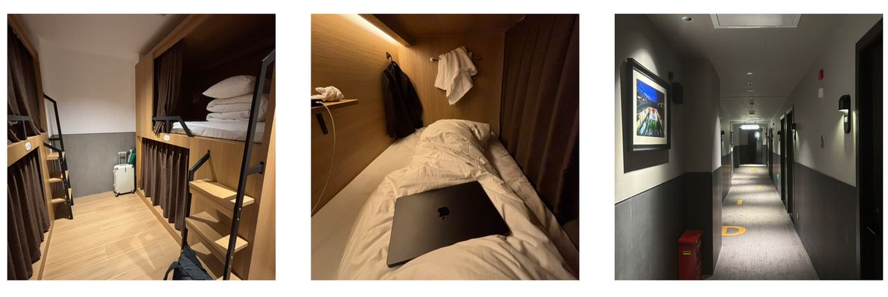 洗漱完毕后我就上床了,此时时间慢慢来到了晚上 21 点左右,陆续有室友回到房间。我原本以为住青旅的大家会比较健谈,打照面时多多少少会说些简单的问候。我看到一个室友后哈喽的「哈」都说出口了,但对方看了我一眼后视线转移到其他地方,导致后面的「喽」给吞下去了。自此,后面再回到房间的其他室友都貌似遵守了这种绝对的互不打扰,整个房间里安静到我在床上敲击键盘发出的声音都不太好意思。我特别担心的呼噜声一晚上也没听到,半夜起床上了个厕所后,安静到我觉得下床发出的声音过大而有些自责。