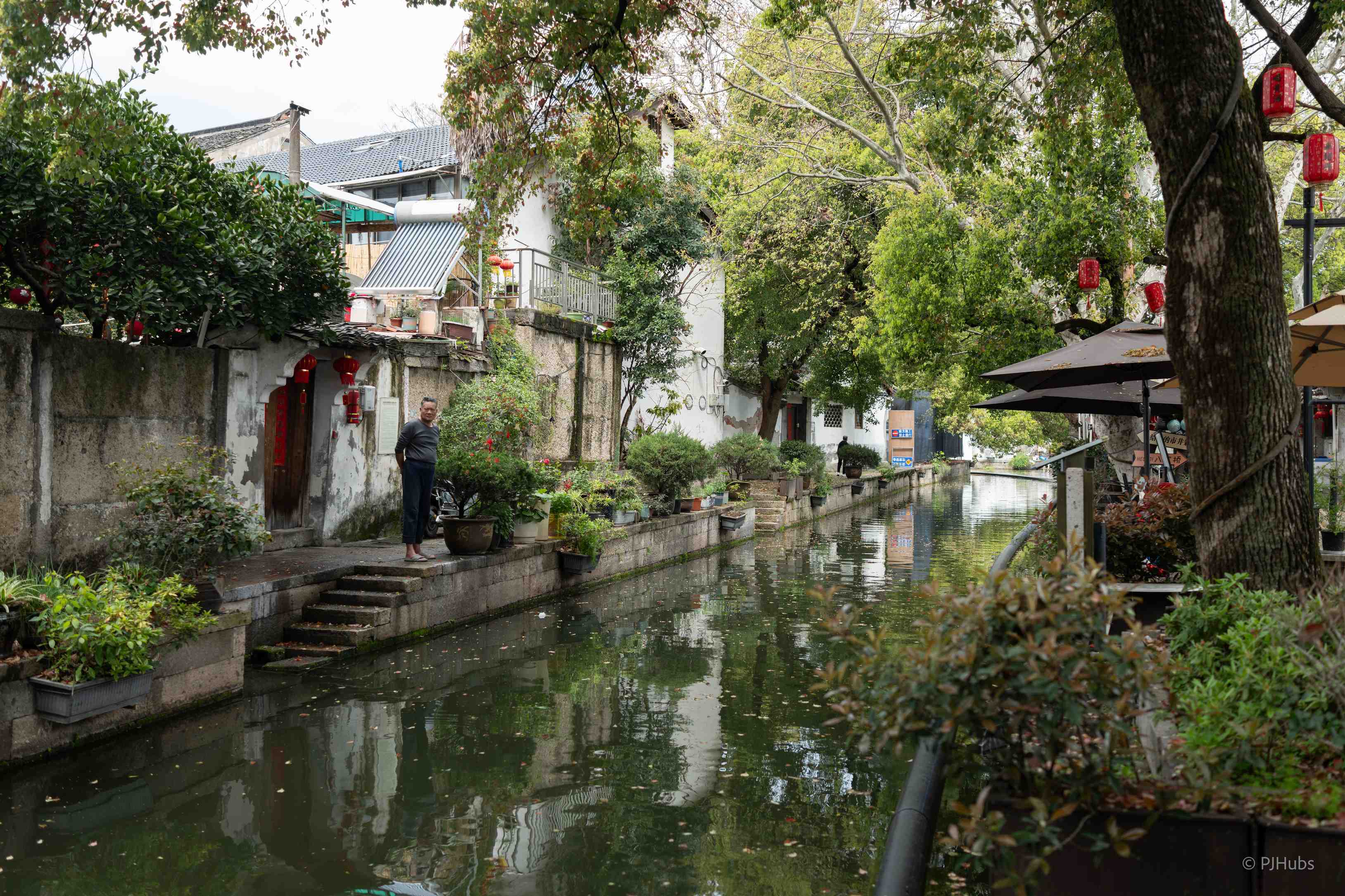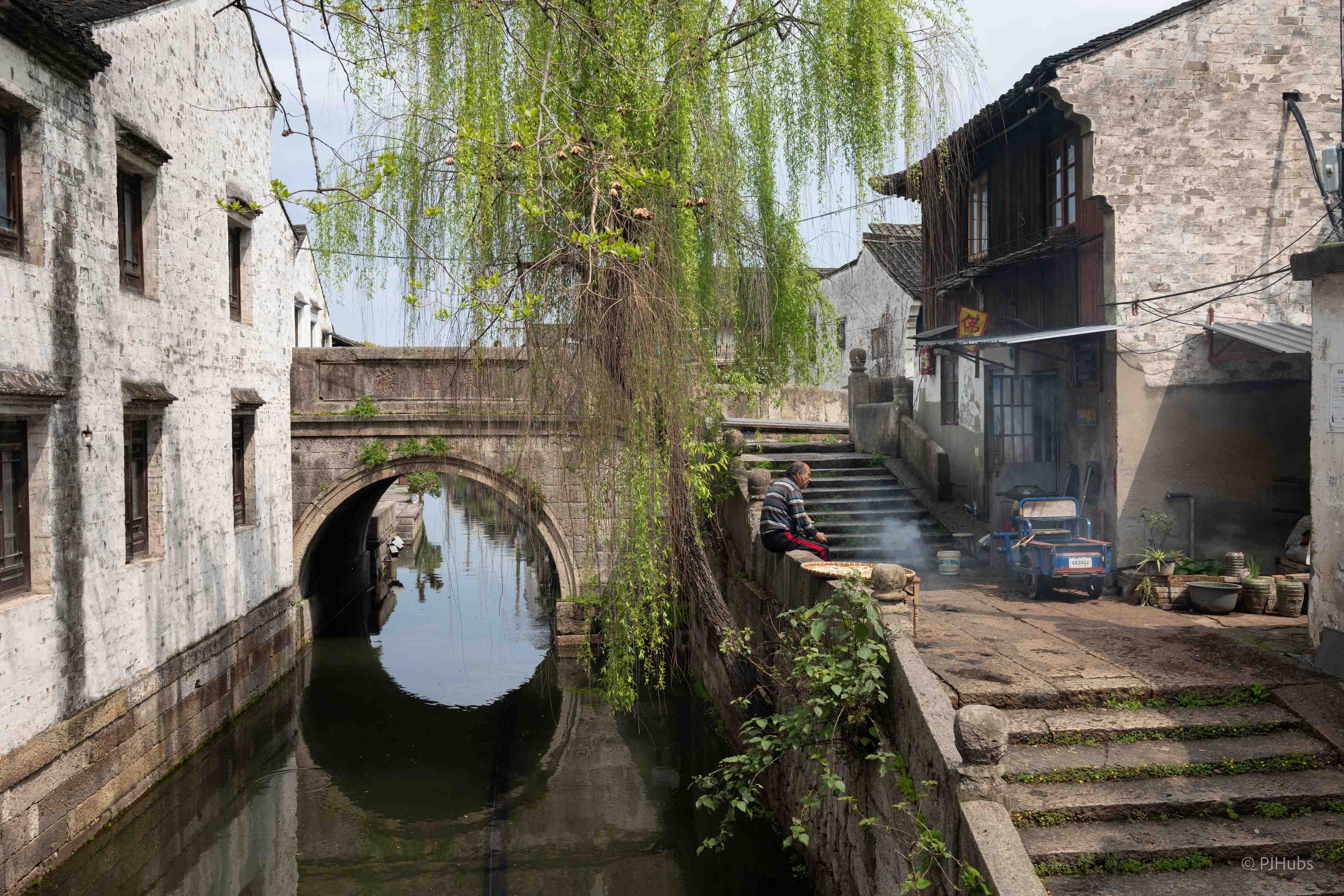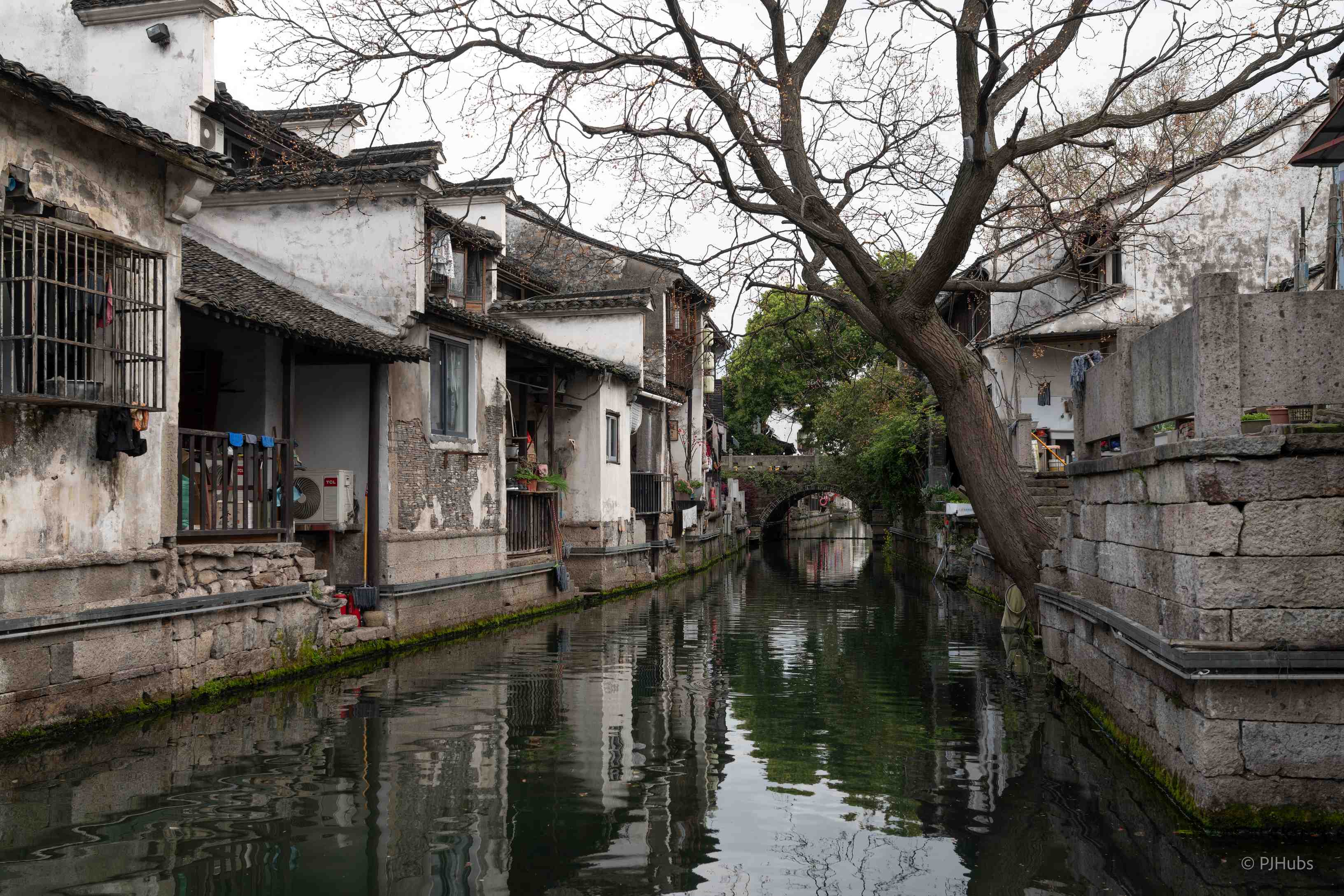 从百草园出来后我就跟着小河走到了八字桥那一大片区域,在绍兴玩耍跟着水走准没错。我一路走一路拍,看到了很多有意思的画面,马致远的「枯藤老树昏鸦,小桥流水人家」完全符合我走在绍兴水城里的所见所闻,古诗里的诗句在此时此刻都得到了印证。